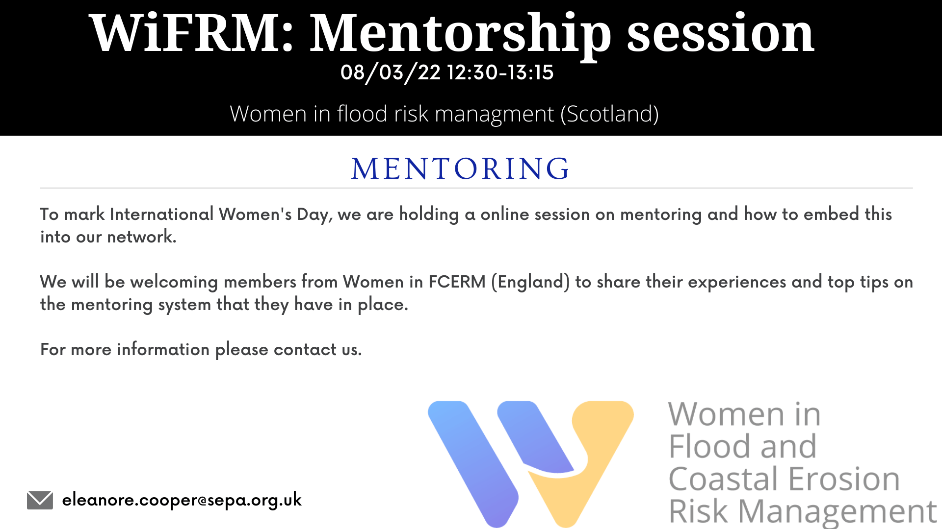 Women in Flood Risk Management (Scotland) are holding an online session on mentoring for International Women’s Day on 8 March, at 12:30.